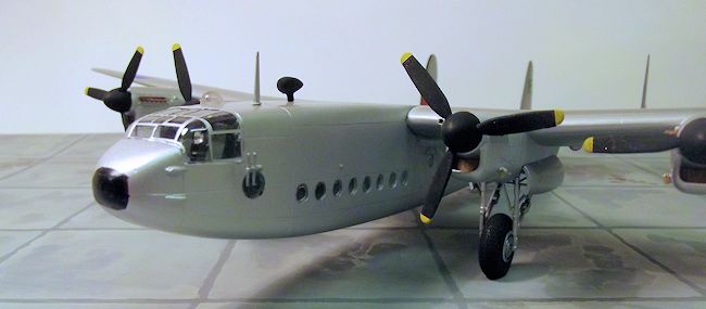 The main sub-assemblies now comprised the fuselage and tail, and the wings with engines attached. The main airframe was assembled for the first time, adding the tail fins and left to set over a couple of days. The main wing to fuselage joint was secured using Devcon two part epoxy resin glue. I then added the main undercarriage and doors from Revell, incorporating the resin main wheels.. Finally the engine exhausts, propellers, fuselage aerials and wing tip lights completed assembly.