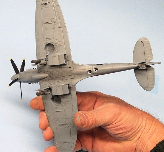 With the cockpit complete, I closed up the fuselage. The rest of the airframe was then assembled. Since I was building an Eduard Spitfire IX at the same time, I used leftover tailplanes from that kit. They fit with minor filing. The fit of the airframe was good needing just a bit of putty in the seams and fuselage sink holes. Next came sanding, sanding, and more sanding! Determined to get a smooth finish on the plane before paint, I spent several hours sanding and polishing the airframe.