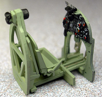 Once completed, I set the engine aside and moved to the cockpit. After assembly, I painted the cockpit British Interior (or European) Green, then painted the instrumental panel flat black. I picked out the instruments by dry brushing white over the panel, and then added some flat red and yellow to further highlight some of the instruments. The kit cockpit is not overly detailed, but since I was trying to build this kit OOB, I opted not to add any details. I also decided I would build it with the canopy closed, just to give myself a little variation from the way I normally display aircraft models.
