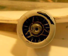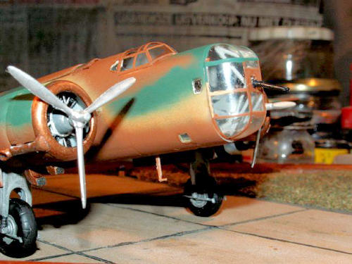 The kit instructions are not of any help here. The interior can be painted in light grey, humbrol 64, instrument panels satin black, as the ends of the steering columns. Guns in gun metal, engines aluminium like, landing gear legs dark brown, the socks matt black, tires satin black/ dark grey.