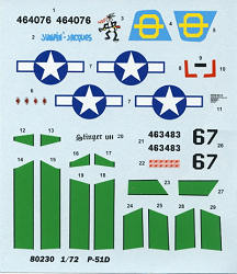 Instructions are a one-sheet affair, with all of three steps to complete the model. The water-slide decals are crisp, appear in register, and are well printed. There are two options offered, 44-64076 of the 3FS, 3FG, 5AF and 44-63483 of 45FS, 15FG. Both are in natural metal finish with the top of the nose painted anti-glare dark green. The color references provided are for Gunze Sangyo Aqueous Hobby Colour and Gunze Sangyo Mr. Color. (Once again, a model company has difficulty with the proportions of the surround on the US insignia. Besides, they ones on the wing should be larger than the ones for the fuselage. You'll need to find replacements. Ed)
