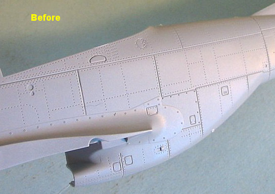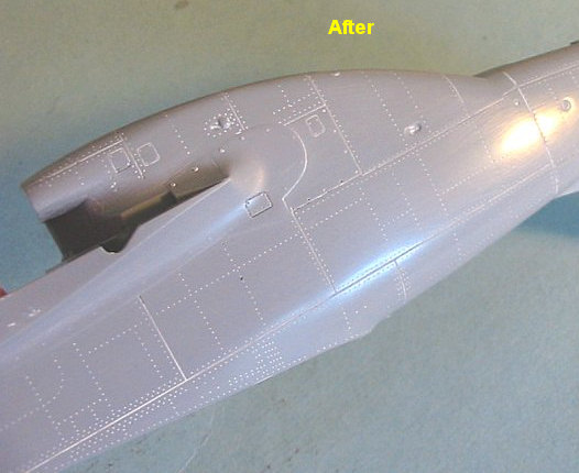 If you sand down the surface, you won’t get rid of the divots, er, I mean the rivets, entirely, but you can reduce them to the point they aren’t much worse than those on the Tamiya 1/32 Zero. That’s still too much for a real Mustang, but it’s a bazillion times better than what we started with. Not only will this tame the rivets, it will also tone down the 1918 Hindenburg Line “trenches” masquerading as panel lines. A final application of rubbing compound worked into the surface will fill in the divots and the trenches even more, so that the final result is a surface that is acceptable. I was looking at the beautiful John Dibbs air-to-air photos of the Paul Allen Collection’s P-51D, which has been restored to 1944 specifications and left in unpainted aluminum, and the remains of the divots on the model are about as apparent as the rivets are in these photos of the real thing.