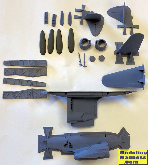 While the 3D printing process makes for a rough surface, it also means large structures can be moulded in place. Unlike the 1980s-vintage resin kits of the Woomera where one would need to butt-join the empennage and wings to the fuselage, the Woomera Models kit has each horizontal tail moulded to its respective rear fuselage half. Likewise the large centre-section wing on each side – complete with engine nacelle - is already moulded to the large fuselage sections. This will make for a very strong completed model. The plastic itself is quite hard and solid – the main landing gear legs are 3D printed but feel stronger than injection-moulded parts.