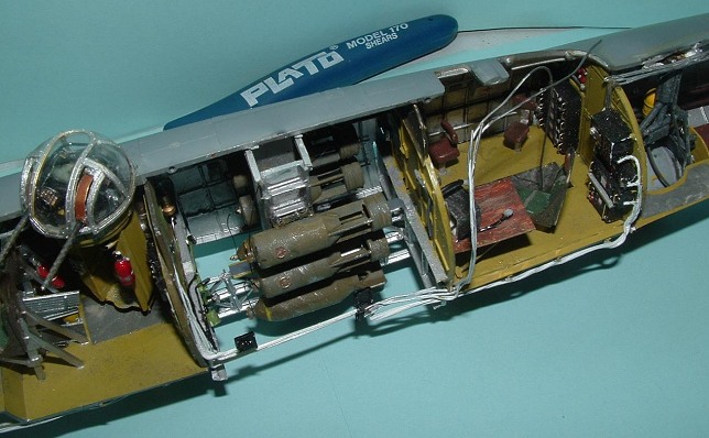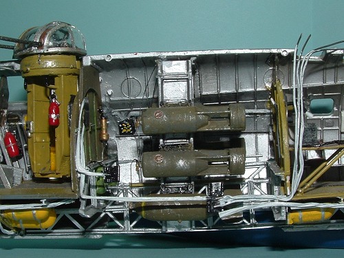 My local hobby shop, Don's Hobby Shop in Kenosha, WI., supplied the Evergreen styrene trusses to build up a more detailed bay and Accurate Miniatures supplied the ordnance. I cut the Evergreen truss material to fit between the aft bulkhead of the radio room and the half bulkhead just under the cockpit. I used larger truss material to add the main wing spars to the fore and aft bulkheads of the bomb bay.