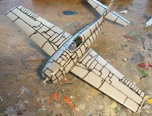 The lower surfaces were painted with Gunze-Sangyo “Light Gull Grey,” The upper surfaces were painted with Gunze-Sangyo “Blue-Grey,” which was then lightened with light grey to “sun fade” the model.