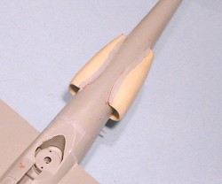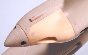 The big thing with this kit is insuring a nose sit. While the real thing has engines and weapons all ahead of the main gear, with the model most of the weight is aft of the gear. Since I had solid plugs in the nose of each boom, I had to put weight in both the booms - above the resin plugs - and in the nose. I put in a little extra weight because I was going to modify the nose gear leg to allow the “tail-low” sit that most P-38s have unless they are fully-loaded for a mission. Trumpeter provides the nose gear with the oleo fully-compressed, which is the way it would be if the airplane were sitting there with full ammo, full fuel, and a full external ordnance load of two 1,000-lb. bombs and the ten HVARs the kit provides. This does make the sit easier, but a completely-horizontal P-38 just doesn’t look that good to me.