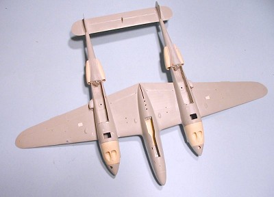 I built this model with the gear installed at the outset, due to the fact that the P-38H was finished with the landing gear legs, gear wells and interior of the gear doors in the underside color, Neutral Grey. (In fact, grey gear is a photo recognition factor for P-38Hs as compared with P-38Fs and most P-38Gs, which have their gear, wells and door interiors in aluminum lacquer, from my review of as every early P-38 picture I have in any book in my collection.)