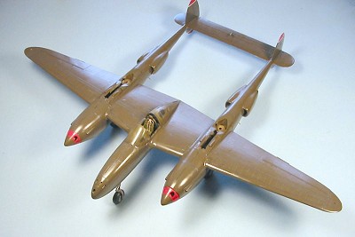 I “muddied-up” the wheels with some Gunze-Sangyo “Sail Color,” applied with a dry brush to set off the diamond pattern in the tread, sanded a flat spot on each tire, and then glued the wheels in position. I then attached the props - remember that the Lightning’s props rotate outwards on both sides. The canopy lid was attached, and I finished off by installing the gun barrels. The antenna wires were done with invisible nylon thread, with a drop of white glue at either end.