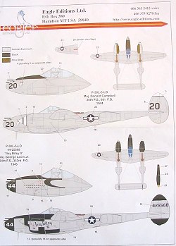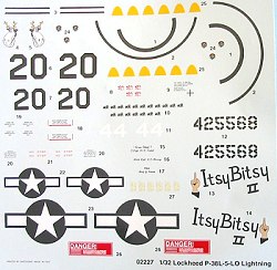 The kit decals are designed and produced by Eagle Editions. They cover two aircraft from the Pacific Theater: “Itsy Bitsy II” flown by Major George Lavin of the 343rd Fighter Group in 1945, and “#20" flown by Major Donald Campbell of the 8th Fighter Group. Fortunately, there are already some 1/32 P-38 aftermarket decals in existence, done for the old Revell kit, which should fit this model, and I have already heard that Eagle Editions has two sheets for release later this month; one of those is “Happy Jack’s Go Buggy,” which I think I shall use for this kit, since I can give it D-Day stripes to break up the monotony of all that silver paint. (One thing to note for painting purposes is that the P-38 only uses about three different kinds of metal in its external construction, which leads to a very monotone look.)