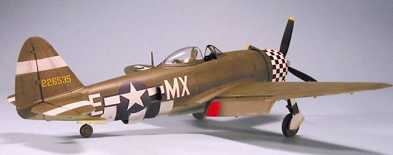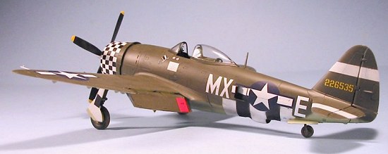 I attached the early gunsight and the canopy in the open position, and attached the landing gear and gear doors. The flaps were attached in the down position. While most photos of P-47s on the ground show them with flaps up, the model looks better with them down, as it is difficult to get the "tight" fit you need with them up. This is the same problem one gets with the Tamiya Mustangs. With the blast tubes and prop attached, the model was finished.