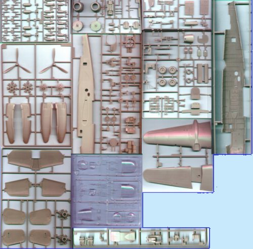 The big box is full of 8 sprues of crisply-molded dark grey plastic, of the quality we have come to expect from the company that produced the TBF Avenger, SBD Dauntless, Il-2 Shturmovik and F3F. Separately packaged is a very clear sprue of cockpit glass; there is some distortion here due to the shapes that had to be molded, and it looks like dipping these parts in Future will be necessary to allow viewers to see the interior in all its glory.