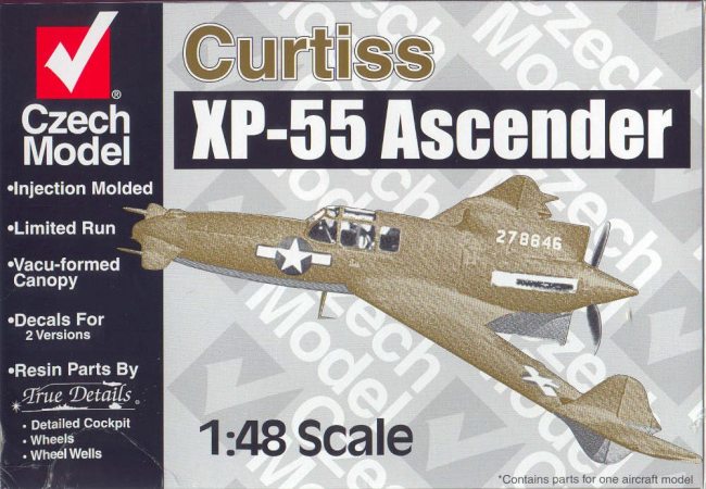 The Curtiss XP-55, certainly among the most distinctive-looking aircraft ever produced by the American aviation industry, was given the company name of "Ascender," - generating thereby the nickname "Ass-ender" in recognition of its "tail first" design. It was originally to be powered (as were the XP-54 and XP-56) by the Pratt & Whitney 2,200 h.p. liquid-cooled 24-cylinder X-1800-A3G (H-2600). Cancellation of this engine in October 1942 meant that other powerplants had to be found for the airplanes. The XP-54 used the Lycoming XH-2470, generating 2,300 h.p., while the XP-46 went with the more reliable Pratt & Whitney R-2800. The XP-55 used the well-known Allison V-1710-95 - which provided power for the P-38, P-39 and P-40 - generating 1,125 h.p. at 15,500 feet. It was planned that the production version would use the Continental XIV-1430-3, which would give a top speed of 507 m.p.h.