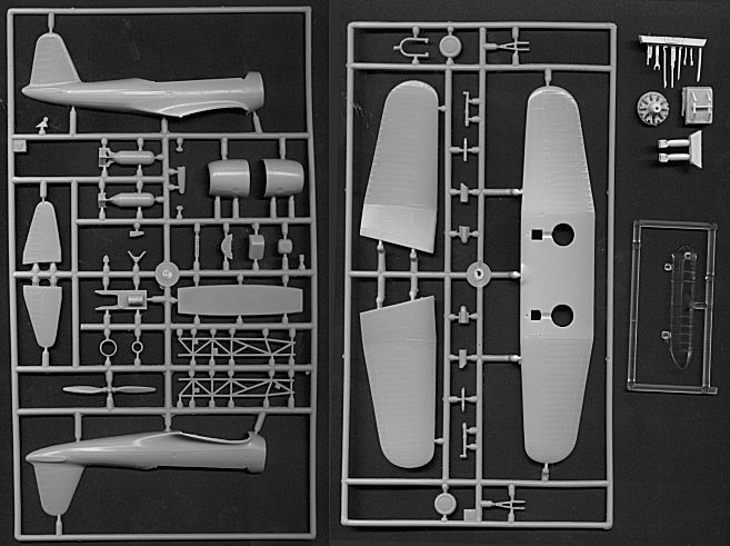 Some detail parts such as the .50 cal. machine gun, tail hook and control sticks are nicely cast in a light tan resin. Detail on the Pratt & Whitney Twin Wasp Jr. engine is excellent, but curiously, only the front row of cylinders is included in the casting. The delicate resin bomb cradle looks as if it will be a real bear to free from its base without breaking it. The injection-molded canopy is quite clear, and contains the center upper fuselage section between the pilot’s and gunner’s cockpits.