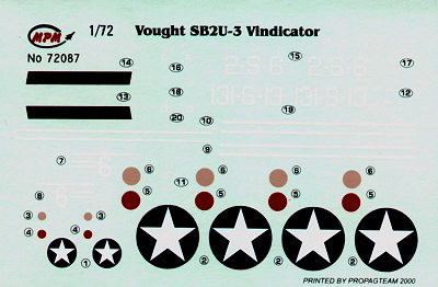 The major parts of MPM’s Vindicator are molded on two sprues of light gray plastic. Panel lines are recessed, with petit rivet detail where appropriate. The fabric sections of the wings and fuselage are well represented, and the kit has the larger stabilizers characteristic of the SB2U-3. The upper and lower wing pieces have a slightly grainy texture that will probably disappear under a coat of paint. Cockpit detail is adequate for the scale, and includes the interior fuselage framing. Unlike recent MPM 1/72 offerings that feature a photoeteched instrument panel and photographic film for the gauges, the Vindicator kit uses simple injected parts for the panel. No crew figures or seatbelts are included.