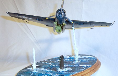 The water was made from silicon bathroom caulk. This was my first time using it and it proved malleable enough to make swells and the various splashes from ordnance etc… After it had dried, I then painted it with a mixture of Gloss Sea Blue mixed with differing shades of blue. Gloss white was used to dry brush the edges of the waves.