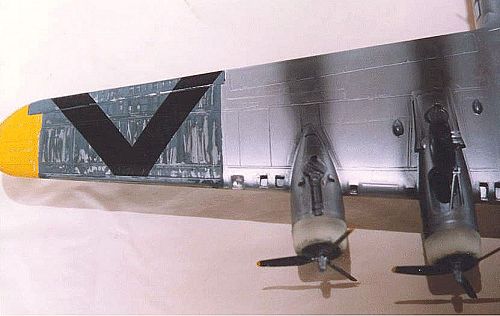 The next step was to attach the engines to the wings and to commence masking up areas of the wings and rear stabiliser in preparation for coats of yellow paint and olive drab and light grey for the replaced wing tip. These paints were from Tamiya's acrylic range.