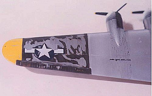 The replacement port wing tip received some special treatment. Before the Olive Drab had dried I used a cue-tip, soaked in thinners to open up areas of the paint to reveal the bare metal underneath. This was done in conjunction with the supplied decal and judicious use of a blade! The lower portion was similarly treated.
