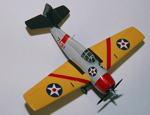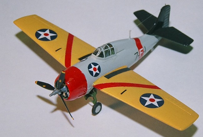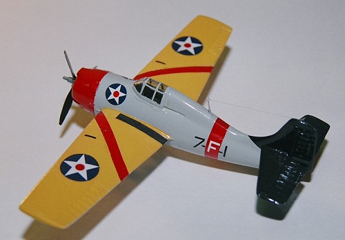 DE-CONSTRUCTION AND RE-CONSTRUCTION: During a culling “Selekzion” the wildcat was slated for liquidation, but I just could not sever this last link with youth. Re-builds had proven to be a waste of valuable modeling time, so the project became a filler, while glue and paint dried on “real” projects. The key to success, limited as it might be, with a restoration, was removing as few parts as possible, so the propeller was the only appendage initially “ectomized”. During subsequent soakings and scrubbings, however, the wheels and gear struts fell away. Must have been stuck on with some of that balsa glue. No loss, since spares were available. Ditto the engine, so I carefully pried off the cowl. This was before the days of Easy Lift-Off and Mr. Strip-a-Kit, so I resorted to the standard arsenal of paint thinner, oven cleaner, tri-sodium phosphate, and brake fluid. Eventually, all the layers of paint dissolved or flaked off. So did several layers of skin. Except for losing its gloss and acquiring a white haze, the plastic was undamaged. I burnished everything with Soft Scrub cleanser, taking care to preserve each precious rivet. The canopy fogged. No replacement was available, but by then I had developed skill in stove-top vacu-forming. I filed down the framing on the original and used it as a form to suck a new one. Wanting to further preserve surface detail, I omitted a primer and airbrushed heavy coats of Model Master enamel, according to a scheme in Squadron / Signal Publications Navy Air Colors V1. Markings were all from the spare decal box, except for the red fuselage and wing bands, which were done by first painting red, then masking. Multiple sprays of Future preserved everything for – well, for the future!