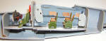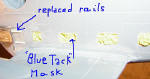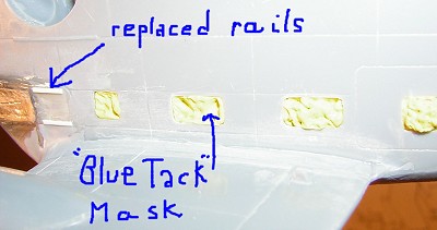 Toughest fix is replacing the cabin windows. Models with panes that must be inserted from inside always pose a paint-masking problem. These, however, could not be inserted from inside, outside, or upside-downside, lacking any flanges or bevels to hold them in place. Nor were they worth saving, being rough, cloudy, and attached with large sprue gates. The least worst technique I’ve yet devised is to back up the openings inside with clear sheet, then mask the recesses outside with “Blue Tac” – type poster adhesive, that gummy-rubber-sorta-like-modeling-clay compound. I’d previously encountered disaster when this stuff wouldn’t unstick cleanly, but since discovered that it will come away easily if cooled by being touched for a few seconds with an ice cube. After painting and mask removal, the windows can be filled flush to the surface with clear epoxy.