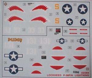 And now, I regret to say, we turn our attention to the decals (horror movie violin riff)! Well, the less said about these the better. Just for the record, the marking options are a shark’s-teeth decorated P38F of the 347thFG on Guadalcanal in February 1943 and ‘Pudgy’, the P38F flown by the ace Tom B. McGuire of the 431st FS, 475thFG in New Guinea late in 1943. The decals are of poor register and are rather thick and ‘crispy’ looking, so I won’t be using them. Airfix’s decals are getting beyond a joke, I can’t understand how they can be satisfied manufacturing them to such a poor standard. I know their decals were never spectacular, but they were at least usable and the same cannot be said for any of the decals I’ve come across over the last three or four years. Looking at some old Airfix decal sheets in my spares box it seems that the ones that have been hanging around for ten years or more are more acceptable than what’s being produced new today! C’mon Airfix, sort yourselves out…