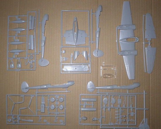The kit comes in a lidded box and consists of 64 pieces moulded in light grey plastic with 3 clear parts. The first thing you notice about this kit is the raised rivets, of which there are hundreds all over the place! The P38 was notable for being entirely flush-riveted so these raised ones are not appropriate, but it has to be remembered that this kit dates back twenty years or more and nobody was too bothered about details such as this back then.