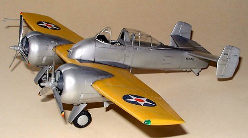 The XF5F, in its original configuration was a snub-nosed, twin-engine, twin-tail design. It was powered by two Wright R-1830’s of 1200 horsepower, rotating in opposite directions to eliminate torque. The design allowed for a central gun installation in the nose and five mini-bomb bays in each outer wing. These housed twenty 5.2 lb anti-aircraft bombs, to be dropped through bomber formations. The fuselage nose, ending nearly a foot behind the leading edge of the wing, allowed for unobstructed forward visibility by the pilot and also the placement of engines in close to the centerline of the aircraft.