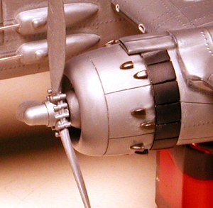 The cowlings were corrected by removing the underscale and poorly molded Clayton ‘S’ stacks and replacing them with new ones, scratch-built using the slat portion of a troop seat from Monogram’s M-34 deuce-and-a-half Army truck for stock. Ayup……all twenty-eight of ‘em! Finally, I glued 5/16” aluminum tubing into each engine front to serve as propeller bearings. The remaining space inside the cowlings was filled with lead shot then I glued the cowlings in place.
