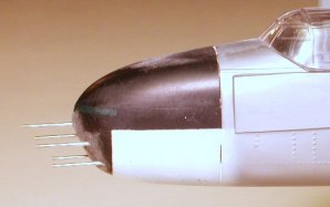 The forward package guns are molded integral with the fuselage, to include the barrels. Those I cut away and replaced with hypo tubing, then I drilled out the shell ejection ports in the fairings. On the inside I covered the visible fairing depressions with sheet styrene, using CA to fill small gaps. When the glue had dried I sanded the inner surfaces smooth to eliminate tooling marks and other effluvia.