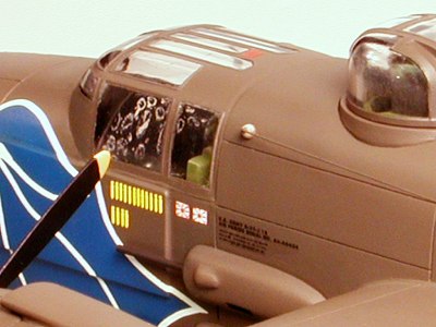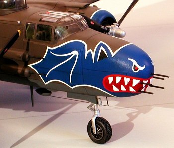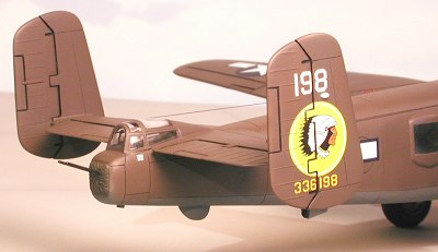 The external cockpit armor is correctly depicted while the package guns are molded to the fuselage sides. Modeling a Mitchell without them will require careful removal and filling the resultant holes. The ailerons are too wide in span, requiring them to be narrowed from the wingtip end by one rib.