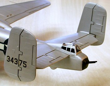 As the fuselage took shape I planned out my methods for concealing the ballast needed to prevent the model from ending up a tail-dragger. Ultimately, I ended up filling the nose, nose gear well, the crawl space, and part of the bomb bay with lead fishing weights plus a few glued into the forward engine nacelles. Very little of the 75mm cannon is visible so deleting it and filling the crawl space was no show-stopper. A short piece of 3/32” brass tubing was used to replicate the visible muzzle portion in the nose.