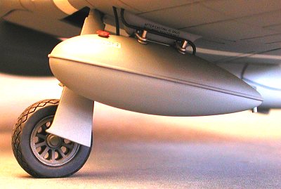 I removed the compression tubes from the landing gear struts then drilled through the torque links to likewise remove the oleo sections. These areas were re-built using aluminum tubing and in the case of the oleos, polished to simulate chrome steel. Brass eye-bolts installed at the bottom of the forks replicated the tie-down rings, while small diameter computer wire was used as hydraulic brake lines. A well was constructed for the tail wheel and installed after removing the molded-on doors and building a new set from sheet stock.
