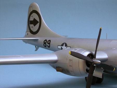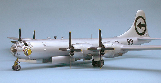 Acknowledging the differences between a regular B-29 and a Silverplate bomber, large plugs are provided for use in sealing off the turrets and observation blisters, though the solution is an awkward and ultimately unsatisfactory for anyone wishing to make an accurate replica of Enola Gay or Bockscar. The problem is that the kit plugs only sit on top of the fuselage, whereas in reality they are flush with the aircraft’s skin. Another accuracy issue with the kit is that the propellers are of the Curtiss Electric variety, which is correct for nearly all of the Silverplate aircraft, but incorrect for the overwhelming majority of regular B-29s, which used Hamilton Standard props exclusively. It took nearly thirty years, but Revell-Monogram recently reissued the kit (5711) with a new sprue that includes the HS props. Modelers rejoiced in knowing that they no longer have to purchase expensive and long out-of-production resin replacements.