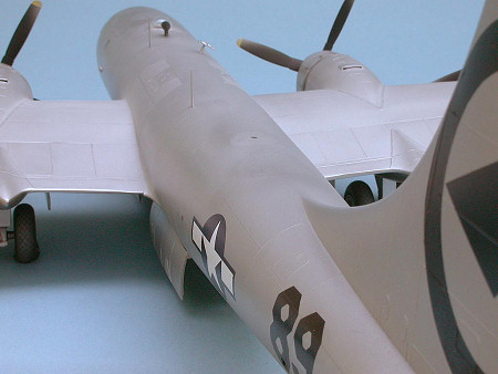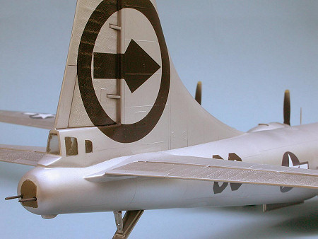 Since this is a natural metal finish model, I had to go on a search and destroy mission to eliminate all the stray scratches and sanding marks. Being such a large airplane, this took quite a while to complete using worn 600 grit sandpaper and Novus Plastic Polish #3 and #2. Those of you that remember my Modeler’s Musings column of March 2006, it was at this point where the model fell off the kitchen counter, where I had briefly laid it down. The right wing was detached, half the fuselage split open, both horizontal stabilizers cracked, and the front turret fairing popped off. It took a while to recover, but I did, and it was time to paint this big model.