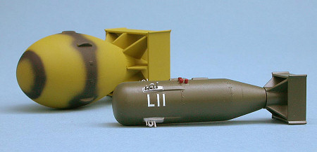 For fun, I built and painted the two atomic bombs. The latest research shows that Little Boy was a gloss dark Olive Drab, rather than the dark blue seen so often in museum pieces. Monogram didn't get it quite right in that the antennae are present in four positions on the bomb, each ninety degrees from each other. The kit piece only has antennas in two places, so I fabricated new ones from stiff wire and added the bright red safety plugs. I also added “L11” from a decal lettering set. The Fat Man bomb was painted chromate yellow with a black sealant sprayed around the circumference of the nose and the equator. The fin structure of both bombs is simplistic compared to the real thing, but I didn't bother correcting that.