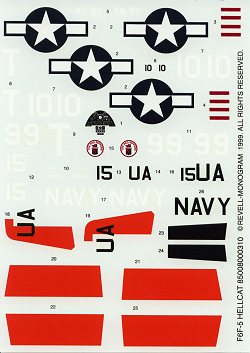 The decals are very nice, being the more recent ones, thin and in register. You get to choose from 3 different F6F-5s, one being a tri-colour USMC bird, the second an all-blue USN machine and the last is a flamboyant F6F5K target tug, with a blue fuselage, yellow wings and day-glow bands all over the place. If you choose not to model the –5K, the decals for the band s will be very useful to trim sections for other day-glow sporting machines.