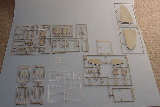 Options for this kit include two under wing 1 000lbs bombs and a big square drop tank under the belly. You also get parts to build up the ‘N’ version’s fin, but without the square tipped wings, these will go into the spare box. The wheels can be built with or without covers.