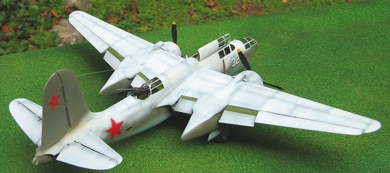 VVS A-20B: I had a few problems with this one. First of all I had what seemed to be conflicting information from my two profiles. The profile in “American Aircraft of WWII” had me leaning towards Winter distemper over the Olive Drab/Neutral Grey-- which would imply that other than having red stars put on, the aircraft had pretty much been put into service as received from the U.S. Lend-Lease program. The Warpaint book on the other hand called for a winter distemper over a Russian Green/Light Blue scheme which would have suggested that once the aircraft were received they were repainted. Ultimately I decided on the Warpaint version and used Polly Scale “Russian Topside Green”, (which actually ended up looking a lot like U.S. Olive Drab) over Tamiya “Light Blue”. For the distemper I used Modelmaster Acryl “Flat White” and did my best to airbrush away from the panel lines so I would get a worn look.