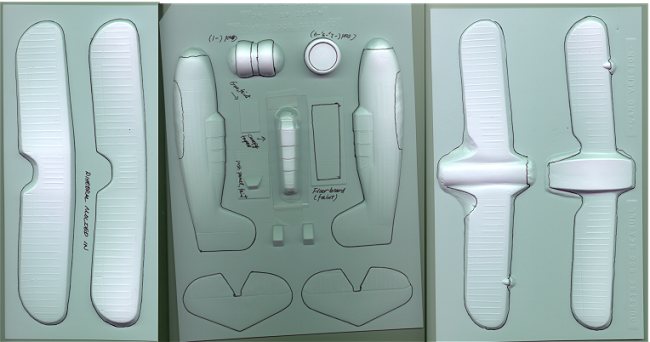 Vacuformed parts provide all the big assemblies: fuselage, wings and tail feathers. Both sets of wings are two part affairs, with decent engraved detail for the control surfaces and accurate-looking rib detail. From what I’ve seen so far, panel lines actually meet up across the various assembly halves – that’s encouraging. You also get two separate cowls, again in halves, to make any SOC-1, -2, -3 or –4. Only the barest interior details are provided – vacuform shapes representing two seats, a floorboard and an instrument panel. You also get the observer’s flexible MG, but that’s a shape scribed into plastic you’ll have to cut out. I immediately ordered a set of pre-war SBD-1 seats from Ultracast, and dug up white metal and plastic MG’s and bombs from the spares box. The canopy is crystal clear, with rather soft frame detail. You only get one, though the fuselage halves have the canopy molded on as well, so in a pinch you could cut out the panes and build something up from that (not a task I’d care to try!)