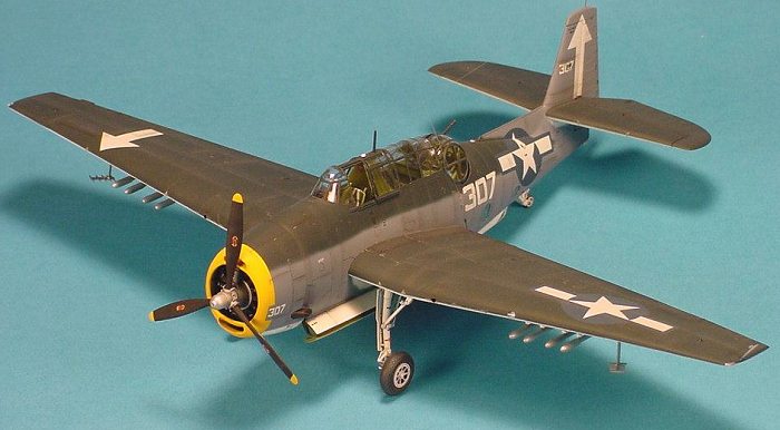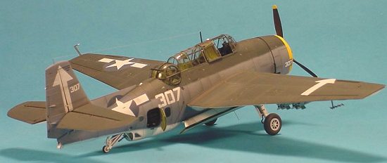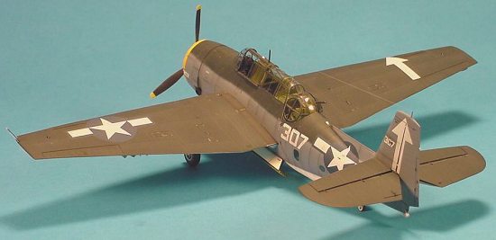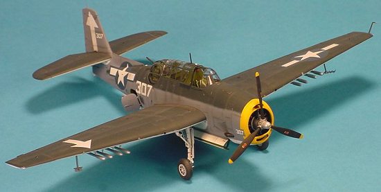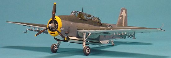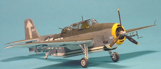 This kit represents a TBM-3 Avenger. These aircraft were designed in response to a U.S. Navy request for an aircraft to replace the obsolete TBD Devastator torpedo bomber. Bearing a marked resemblance to the F4F-4 Wildcat, the TBF was capable of meeting the Navy requirements for a bomber that had a 300 mph top speed, internal bomb load of 2,000 lbs., a three-man crew and a defensive dorsal turret. With its rearward-folding wing design and prototype proven performance, the TBF was ordered for production in December of 1940. The first aircraft were delivered to the Navy on January 30, 1942, and by this time had been christened with its official name "Avenger" in response to the attack on Pearl Harbor. Grumman Aircraft was producing sixty aircraft a month by mid-1942. The Navy requirement for aircraft was more than