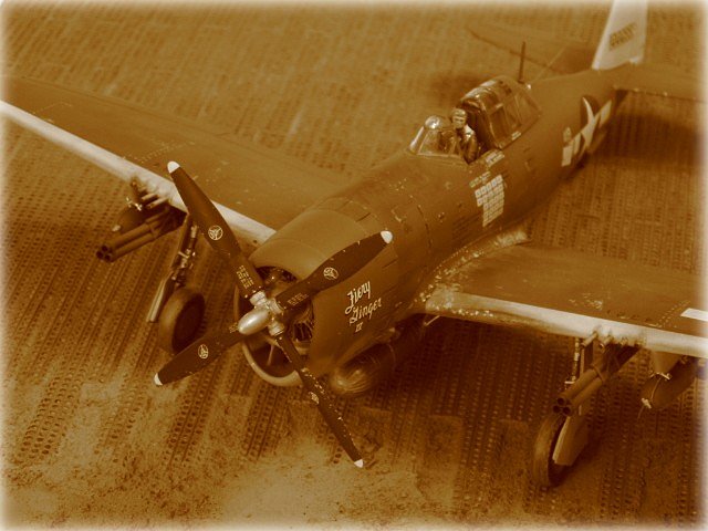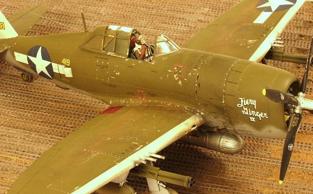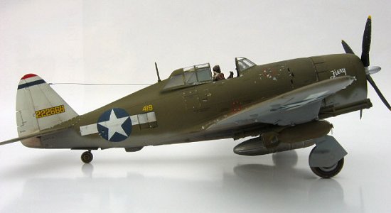 To do justice to this kit I elected to replicate the steed of Congressional Medal of Honor winner Col. Neal Kearby. The Colonel flew four different P-47’s during his time with the 348th FG in the Pacific Theater, this P-47D-4-RE being his last plane during a temporary assignment to 5th AF Staff. Col. Kearby was in a race-for-top-ace, with the very popular P-38 driver Dick Bong, when shot down near the Japanese airfield at Dagau after being jumped by three TONY fighters. The operational environment of the island hopping campaigns in the pacific left the aircraft very weathered and somewhat beat-up looking. This model attempts to capture the sense of enduring effort and the “operational” look of a front-line fighter in the campaigns against the Japanese, advancing from one island PSP airstrip to the next.
