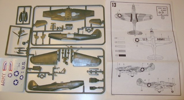 This model is described as a “P-39 Airacobra”. There is no information about which model it might be-- I think this kit is intended to be a US Army Pacific theater “D” or “F” model. I also think the same kit has been released as a later model, with Soviet markings. The kit includes the under-wing gun pods carried on later versions of the P-39. These guns are called out in the instructions as parts that are not used.