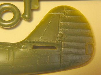 The kit consists of 31, molded in a medium green. Panel lines and rivets are raised, but finely molded. (No golf-ball sized rivets here!) My model had very clean moldings— no signs of mis-alignment, with a little bit of flash. Trailing edges seem to be pretty fine, though they all have a little bit of flash. I’ve included a shot of the fin and rudder, which should give the reader a pretty good understanding of how the surface detail looks.