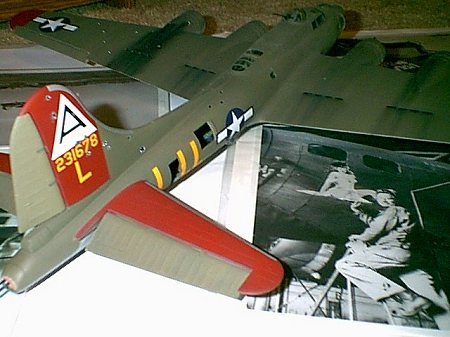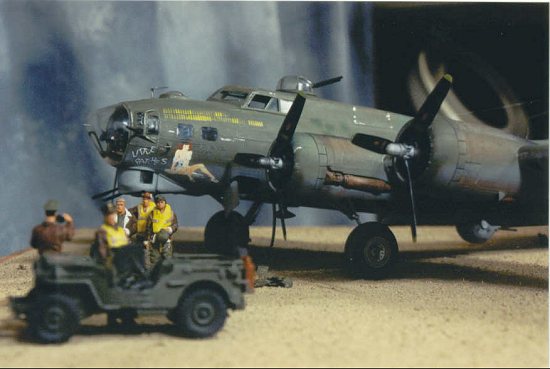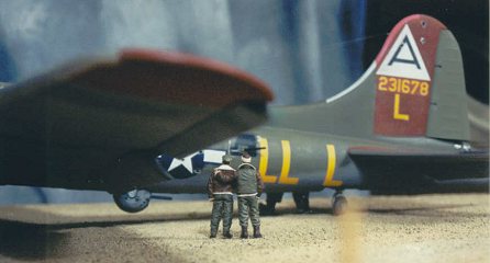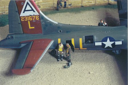 I started this kit early in the winter of 1999, and finished “Little Patches” on February 26 2002. My first goal was to find a subject that I wanted to portray as a diorama when finished, and spent numerous hours searching books, the web, and articles until I was flipping through the pages of Squadron’s B-17 in action and on the back cover, was what I was looking for!