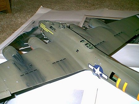 Now was time to paint fuselage and wings which were airbrushed in standard olive drab upper surfaces, neutral gray lower, and red tail, all of which I toned down a little to represent a more weathered look of an aged B-17.also the chin turret of “little patches” was another 2 shades lighter of which countless hours of looking, resulted in no known reason for this other than probably a flack hit in nose area and was repainted in a much lighter color of gray. Enamels were used on entire plane, as I have not mastered the acrylic side yet and prefer enamels to which there are pros and cons.