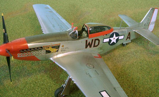Converting the Tamiya kit to the specs of McKennon’s mount required some selective chopping and/or filling. Biggest pain-in-the-you-know-what was puttying the panel lines on the wings prior to painting them silver, as per North American Aviation policy ca. early 1945, when RRIII was manufactured. The idea of puttying over perfectly good panel lines set off all kinds of mental alarm bells for this modeler, but facts and photographic evidence won out over instinct in the end. Still, the process did involve something of a leap of faith.