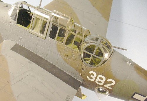 Perhaps one of the most tedious processes of the entire project was masking off the large greenhouse canopy and the gun turret. The turret had been masked and painted before being inserted in the fuselage, and was covered with drafting tape for this part of the process.