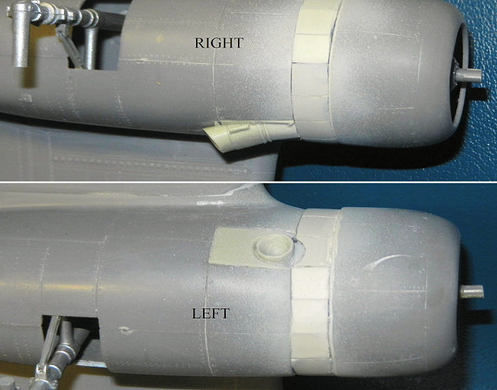 On to the engines…another challenge! After checking the parts and thinking it over I realized that, though a little bit damaged during shipping, the engine cowls from Parts R Parts were better and would require less surgery and work than the original AM ones. So I removed the few broken cowl flaps and replaced them with thin plasticard. I oversanded the pouring stab for these parts so then I had to add some 2 part epoxy glue to rebuild a flat front area that would properly match and fit the back of the engine cowlings…talking about these it was very easy to open up the front end using sanding paper to remove the excess of plastic previously marked with a pencil and a template. The carburetor intake supplied by AM is wrong and thus replaced with the Parts R Parts one after sanding it a little bit.