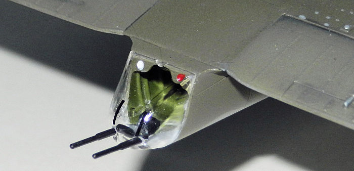 The fake guns were added to the tail cone which also received 4 strips of black decals to represent the painted on “runners” for the guns. A piece of plastic painted black was installed in the tail opening to represent the camera that recorded the raid. The tail cone was glued in place.