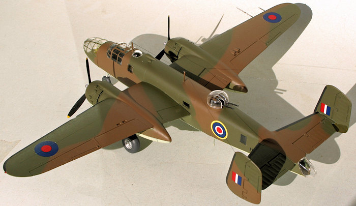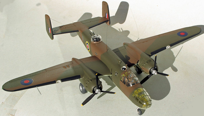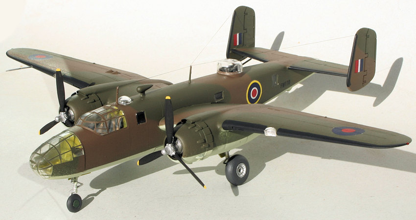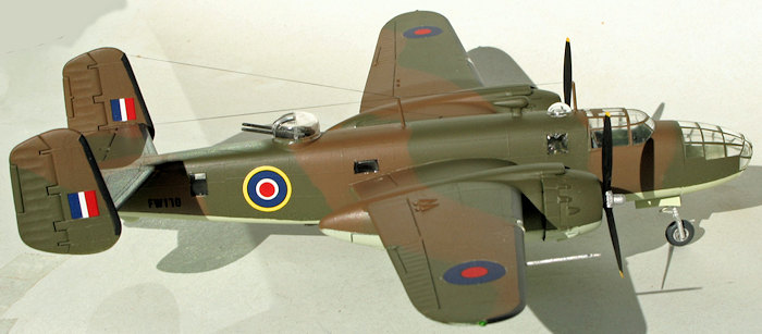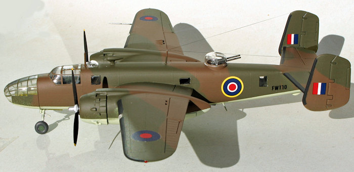 There are decals for two versions, a USAAF B-25B, 40-2344, Col. Doolittle's aircraft from the famous Tokyo raid of 18 April 1942, and a RAF Mitchell II, FR397, MQ-V, from 266 Squadron in June 1944. I chose to model R.A.F. Mitchell II, FW170, a B-25C ex 42-87611, at Kirkbride, 28 May 1944. This aircraft was probably painted in the factory with North American's interpretation of the RAF standard scheme.