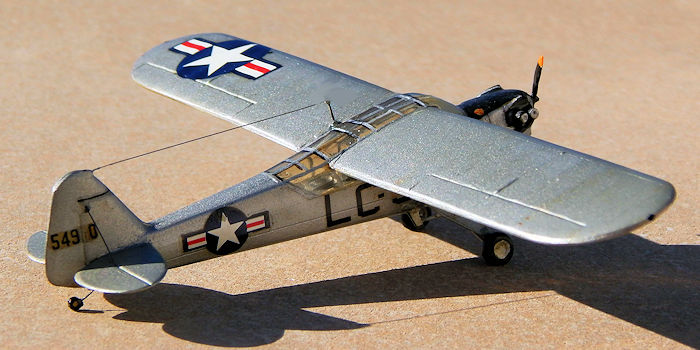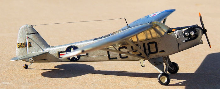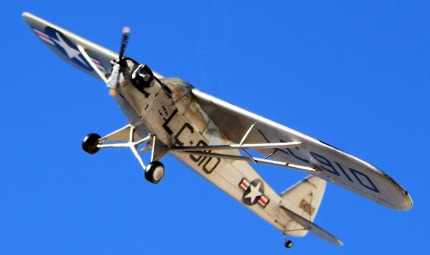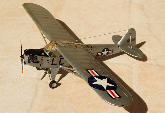 The post war livery applied to the L-4 represented a Grasshopper in USAF markings assigned to Civil Air Patrol CAP with Air Force serial number 54910. It is overall silver finish on fabric and metal parts. Interior was cockpit green with leather brown crew seats. It was given a coat of clear Modelmaster lacquer overall.